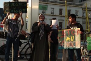 Aujourd’hui nous avons manifesté pour le Congo pour le génocide qui se passe au Congo en parallèle aussi pour la Palestine, contre Appel parce que Appel utilise des matériels qui sont extraits du sol du Congo extraits pas forcément de manière illégale et beaucoup de gens là-bas au Congo et des minerais qui sont extraits par des enfants qui souffrent qui travaillent dans des conditions vraiment déplorables et au risque de leur vie tous les jours et donc on avait cette responsabilité nous et moi je suis ivoirien pas forcément congolais mais c’est de ma responsabilité aussi pour le continent pour mes frères congolais , aujourd’hui me lever et d’aller manifester contre cette société de consommation qui pousse les africains qui pousse les congolais précisément ici à vivre dans des conditions déplorables au nom du capitalisme et c’est pour ça qu’on est là aujourd’hui et donc on a montré notre mécontentement et on a fait passer notre message et je suis très content d’avoir participé à ça parce que j’ai fait ma part.